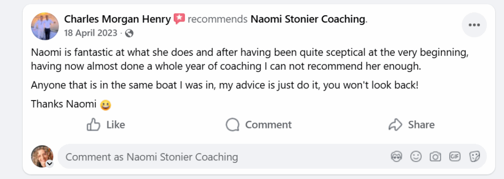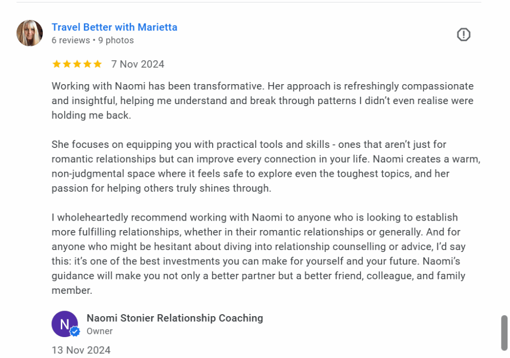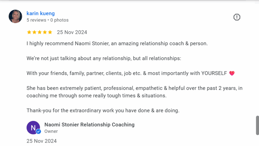 My name is Naomi Stonier. I’m a relationship coach, trained by Tony Robbins and the Relational Life Institute.